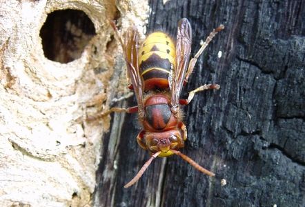 European Hornets are semi-social insects and are not commonly found near urban areas. Unlike the Bald Face Hornet European Hornets rarely build their nest in the open. Their nesting sites can be found on the side of trees, around rocks, inside hollow trees/logs and in the walls of homes.
